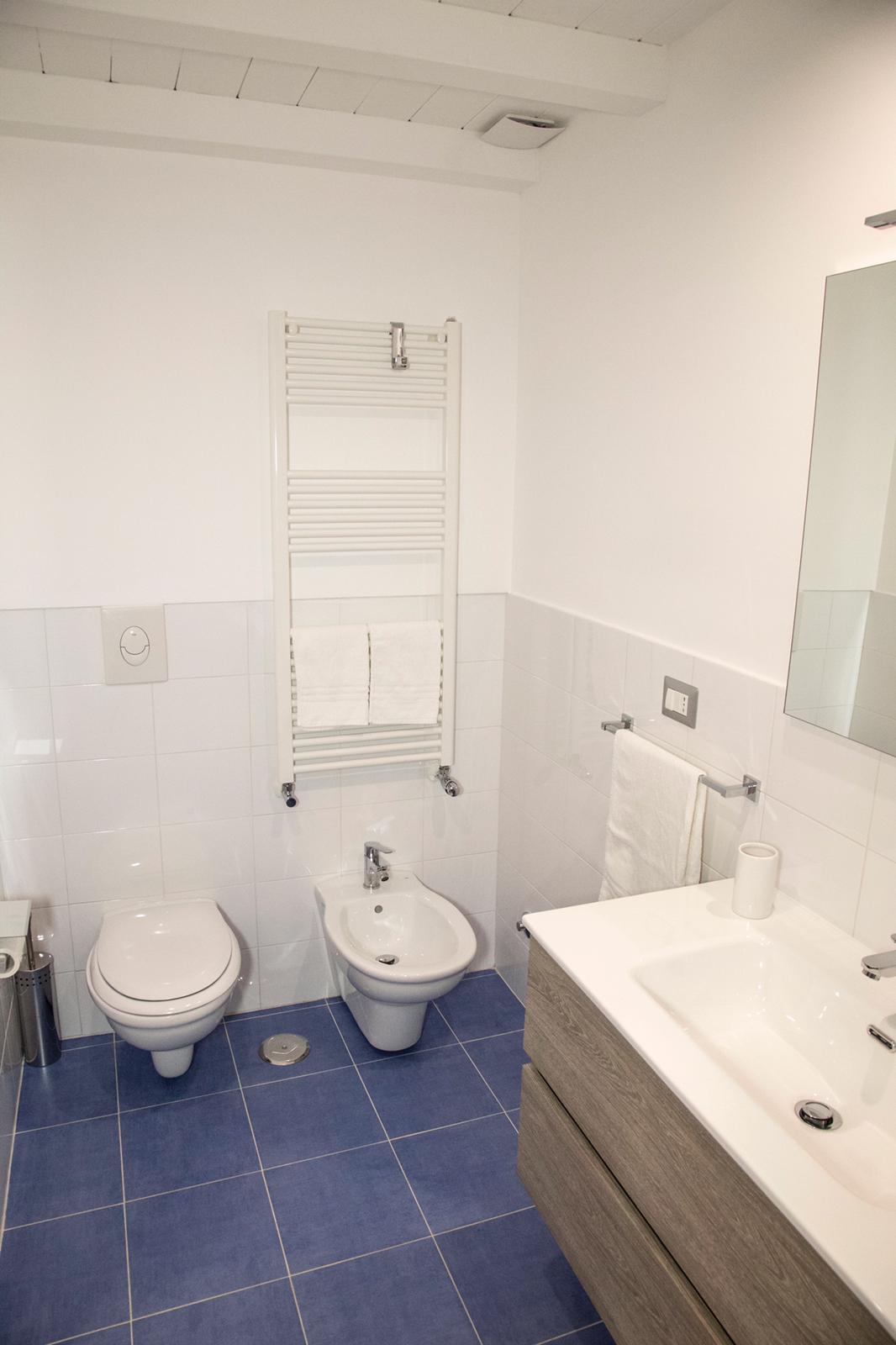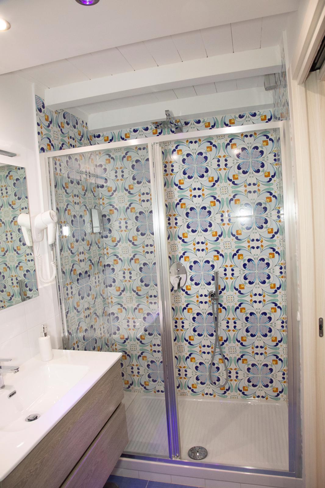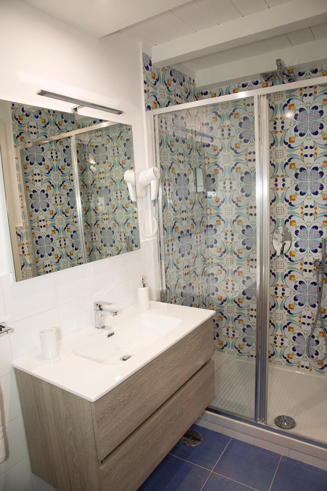 Ampio bagno in camera in stile Vietri, dotato di doccia con cromoterapia, asciugacapelli, corredo teli spugna e doccia shampo.