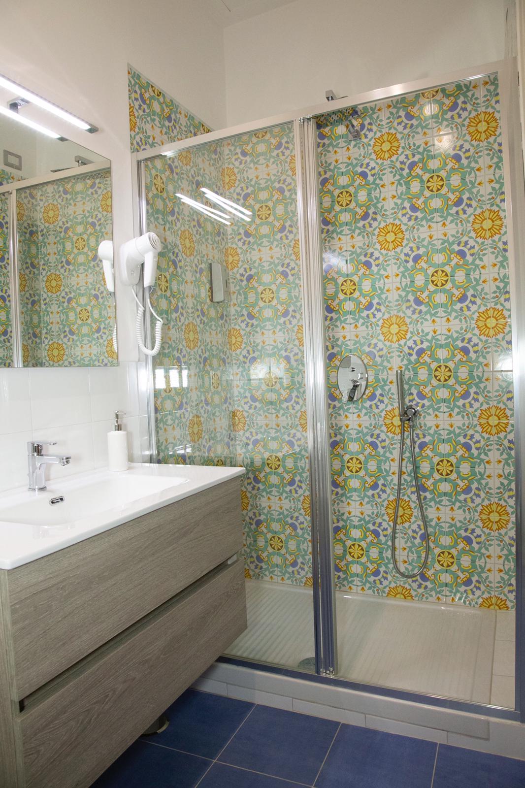 Spazioso bagno in camera in stile Vietri, dotato di ampio box doccia con cromoterapia, asciugacapelli, corredo teli spugna e doccia shampo.